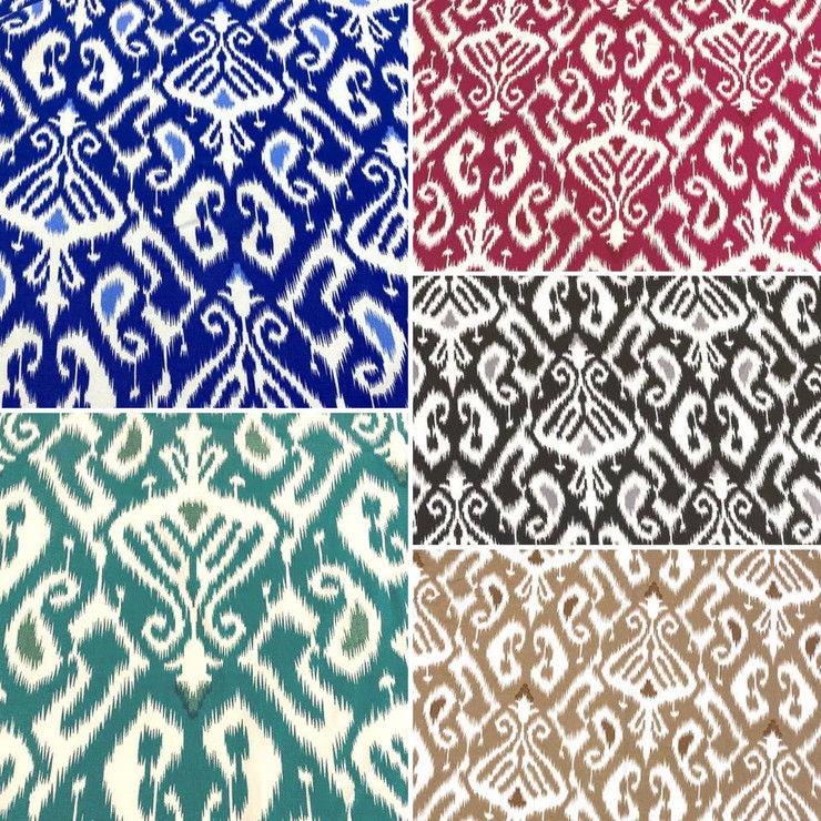 Сегодня, ткани с узором Икат активно представлены в ассортименте нашего магазина. Шифон, джинс, вискоза, модал - вот небольшой перечень тканей, которые доступны к заказу.