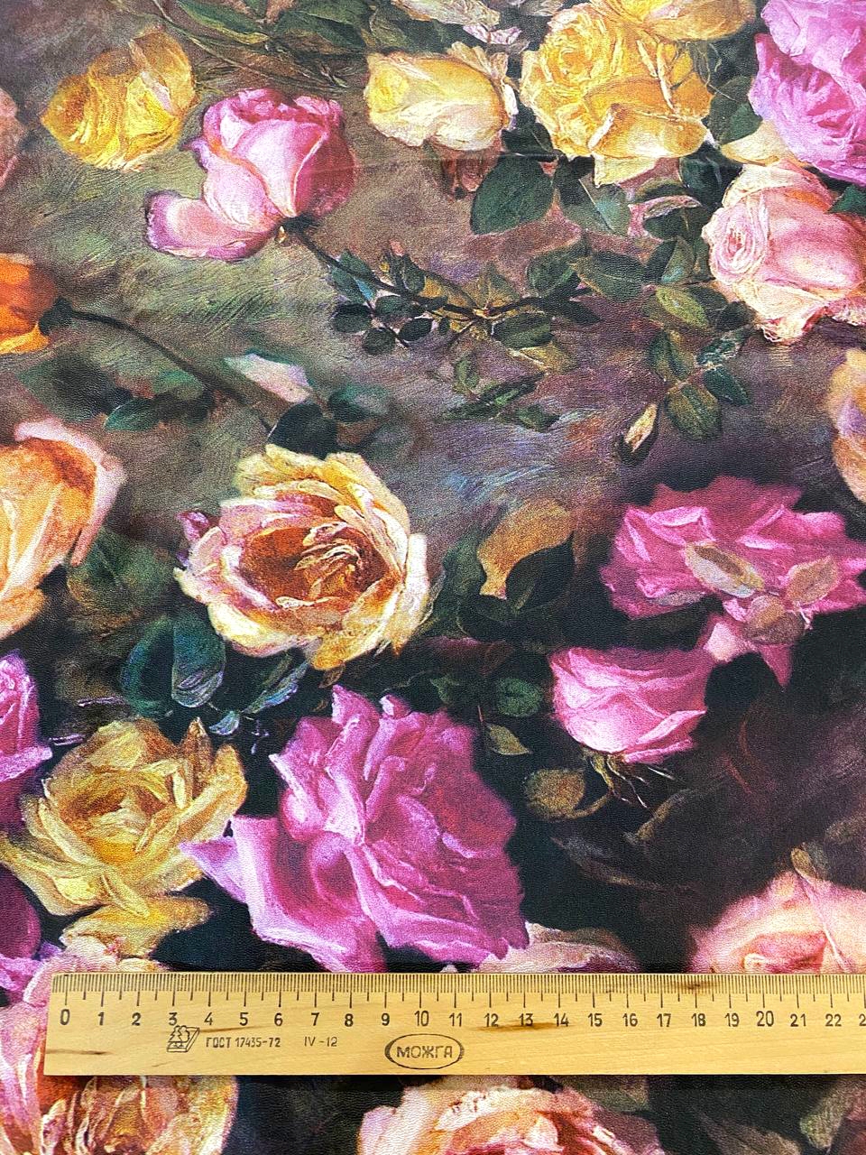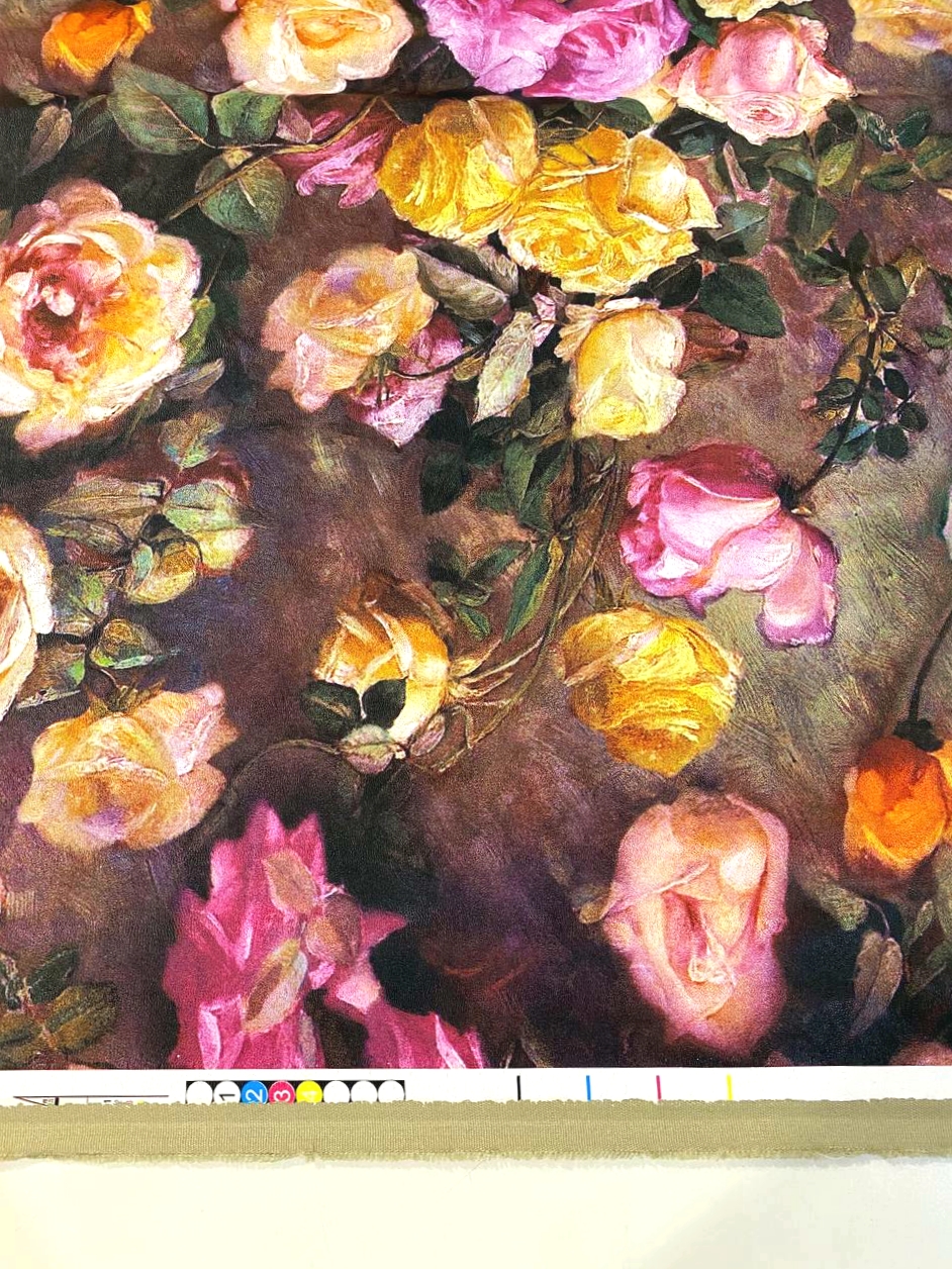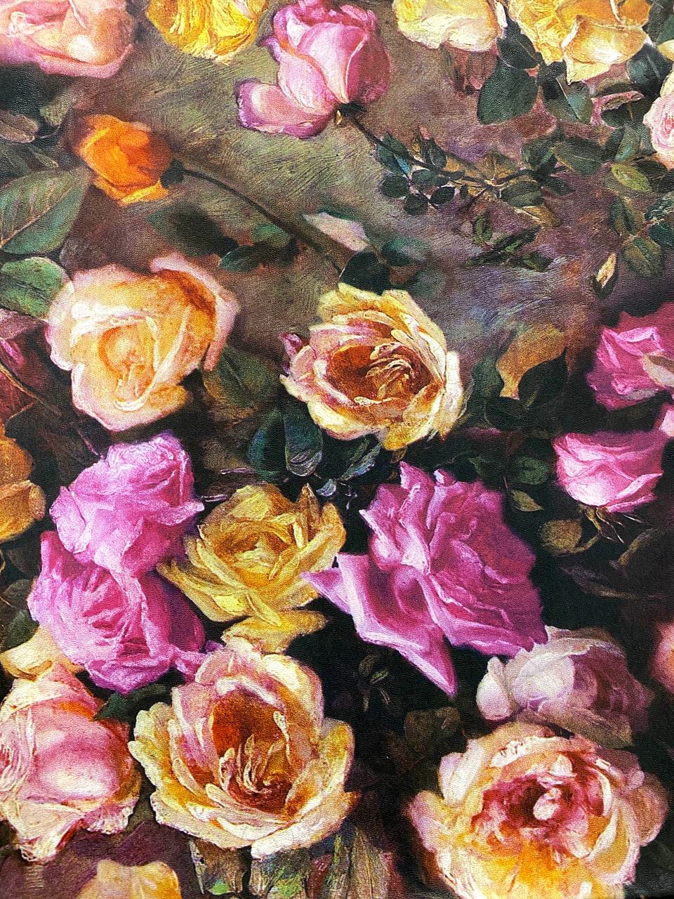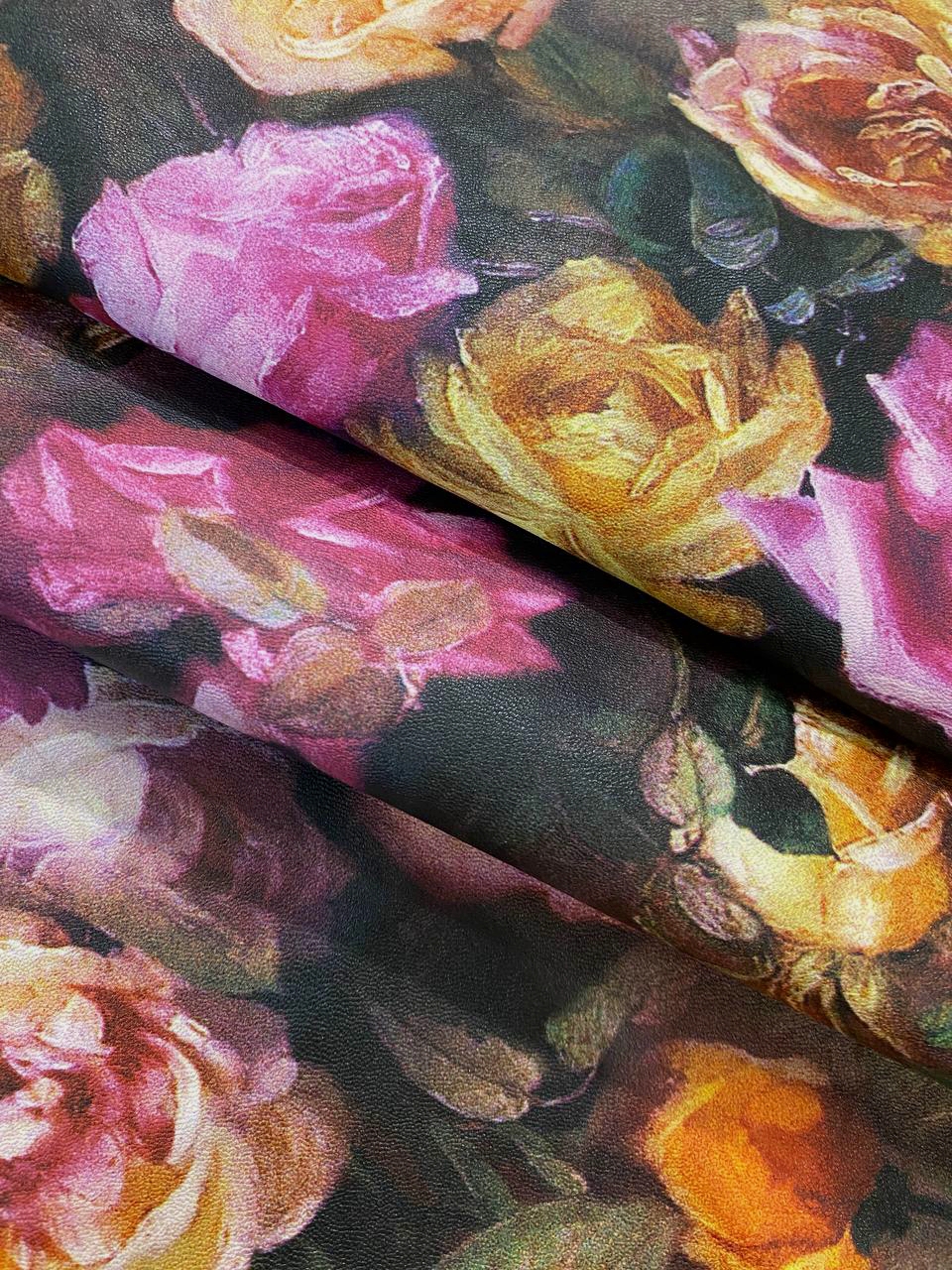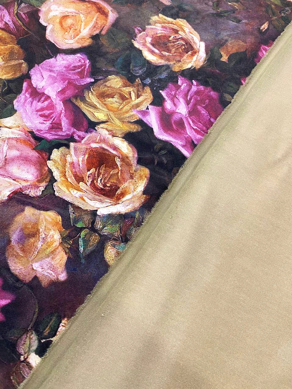 Основной фон сложного, но красивого оттенка с нанесенным роскошным, женственным, цветочным рисунком.