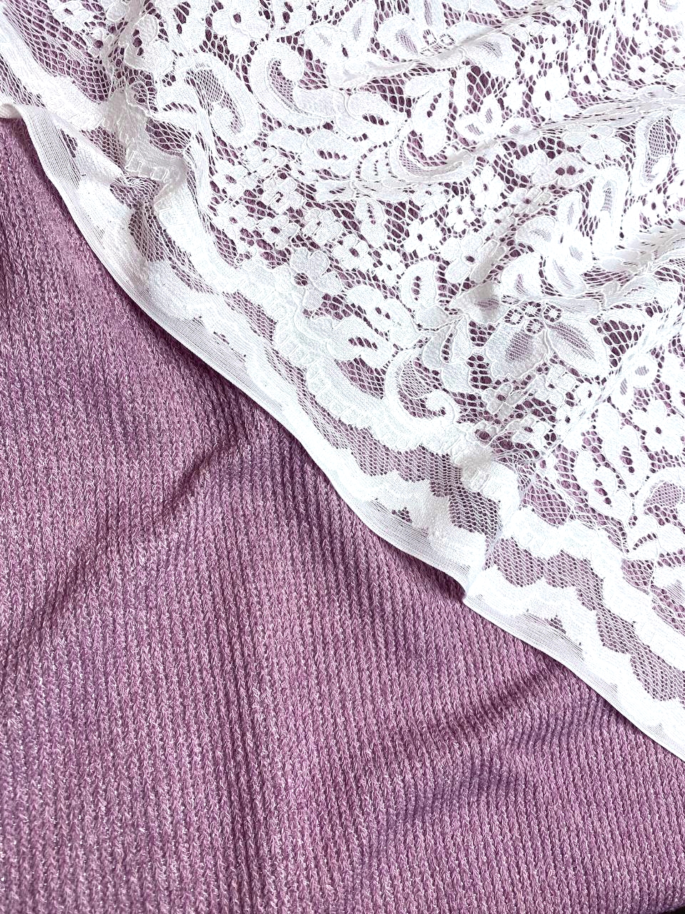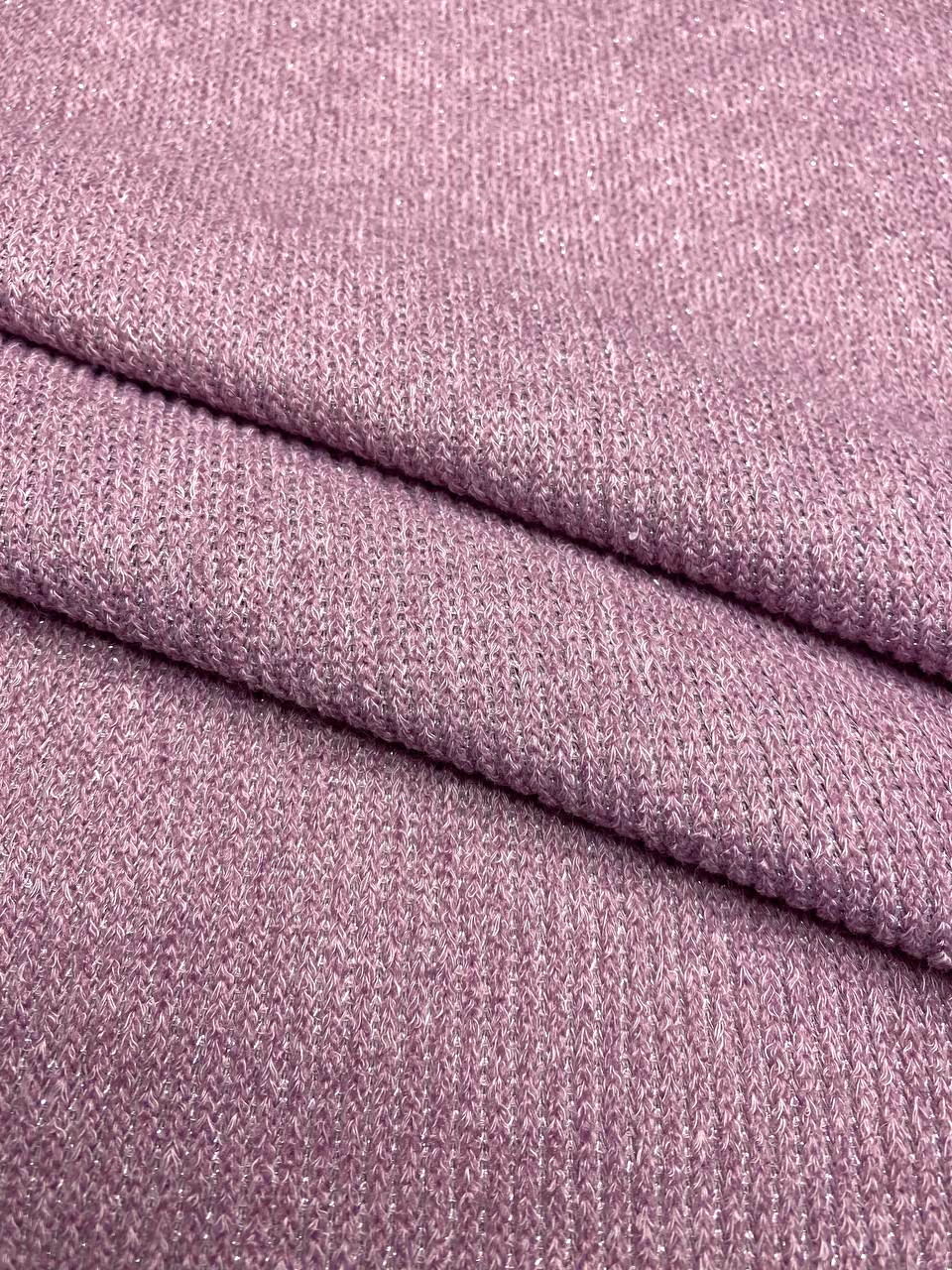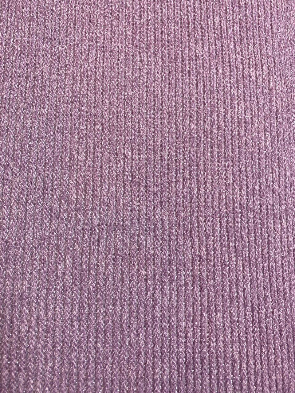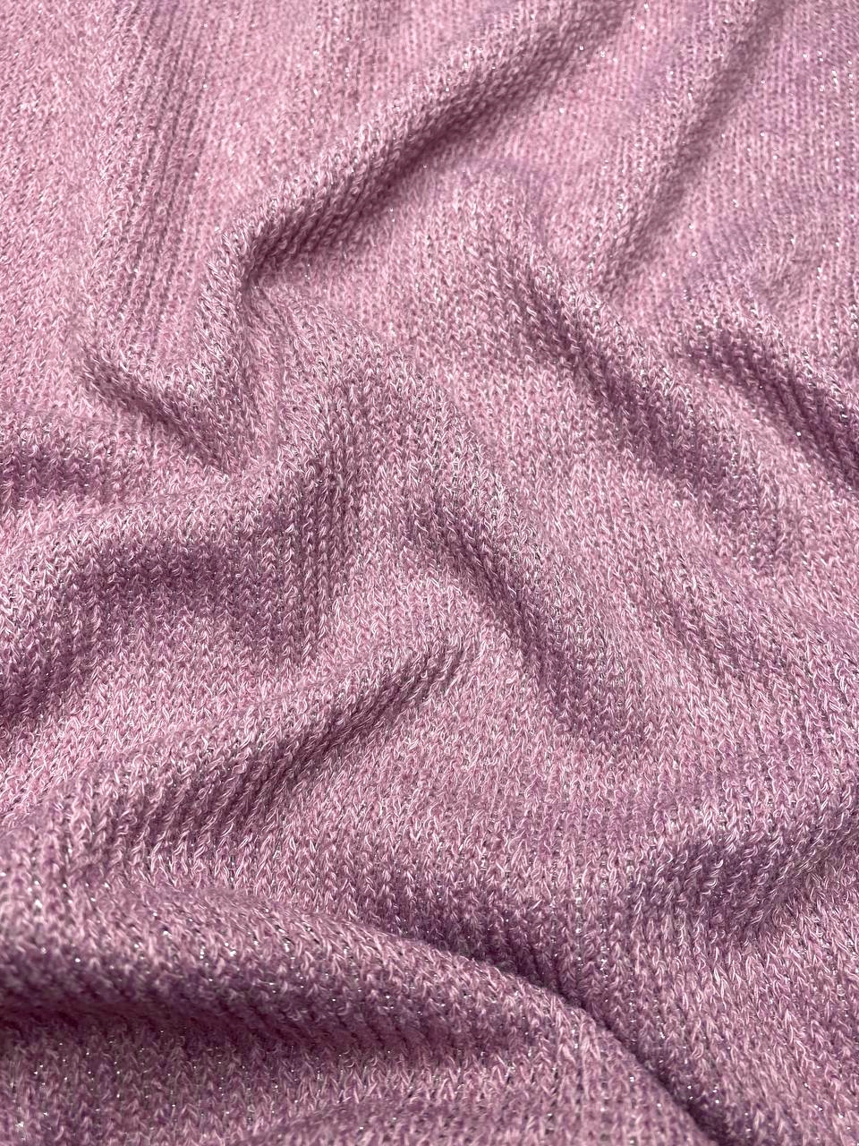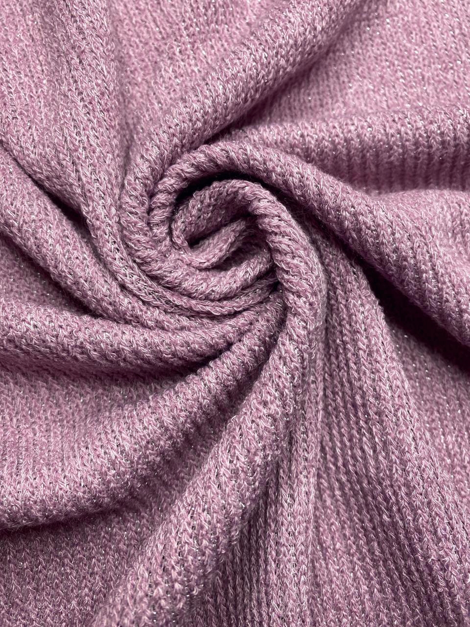 Трикотаж с выраженной меланжевой вязкой с добавлением нитей бледно - розового люрекса.