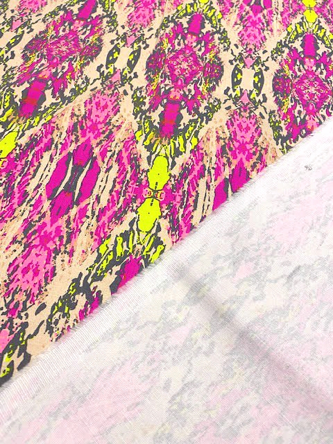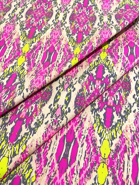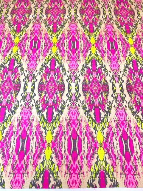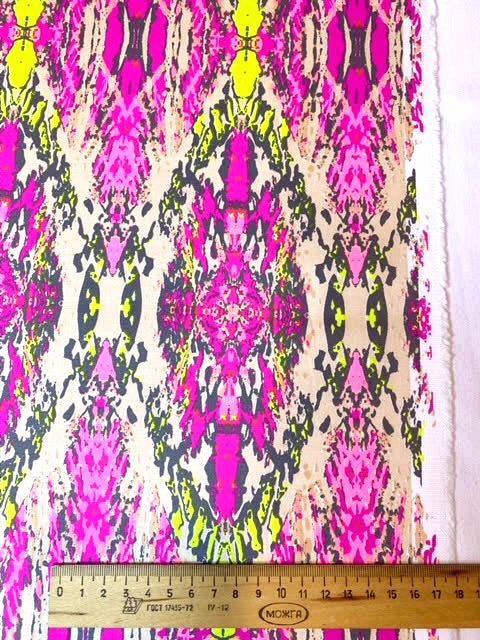 Принт выполнен в стиле "Икат", очень ярких, неоновых оттенков.