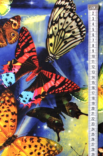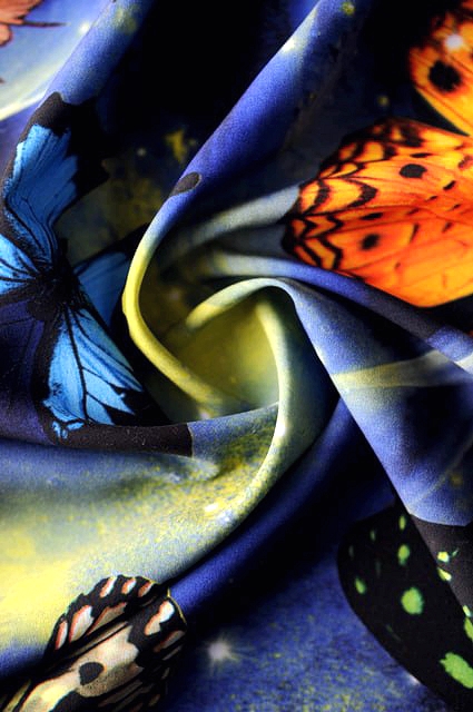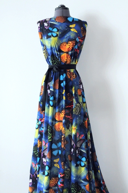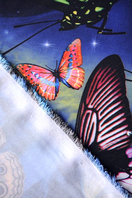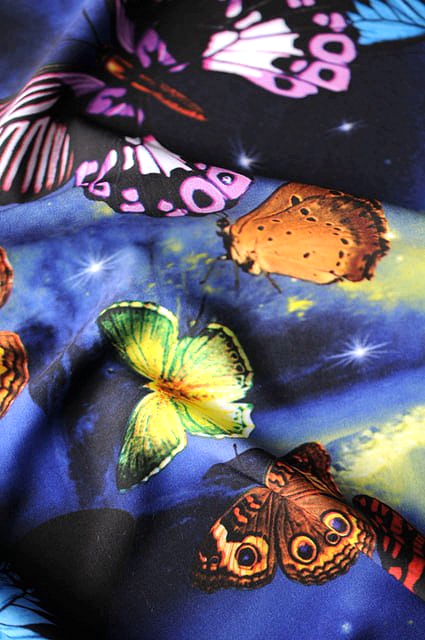 Принт выполнен в виде бабочек средних размеров, нанесенных на темно - синий фон.