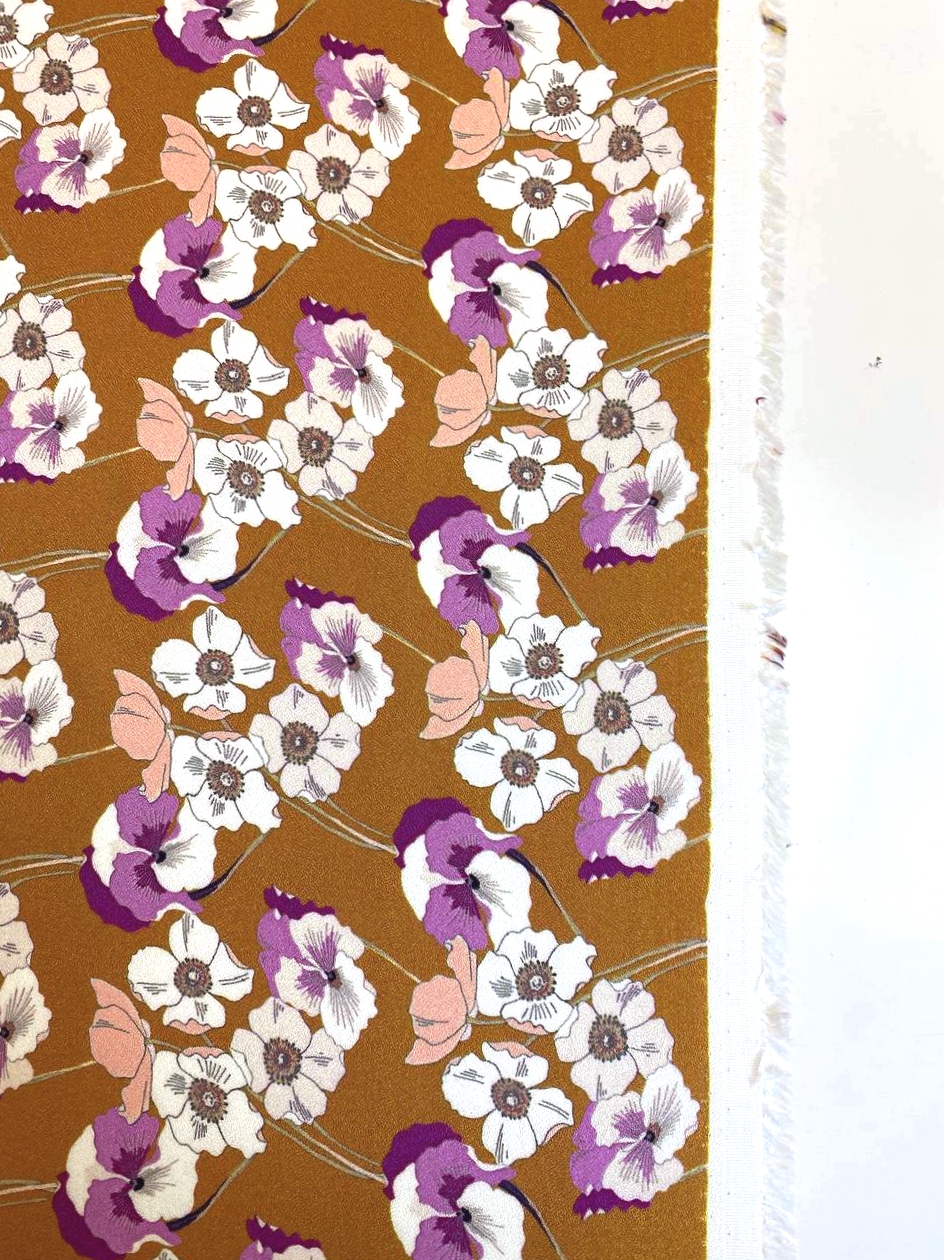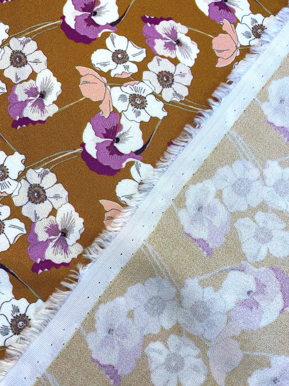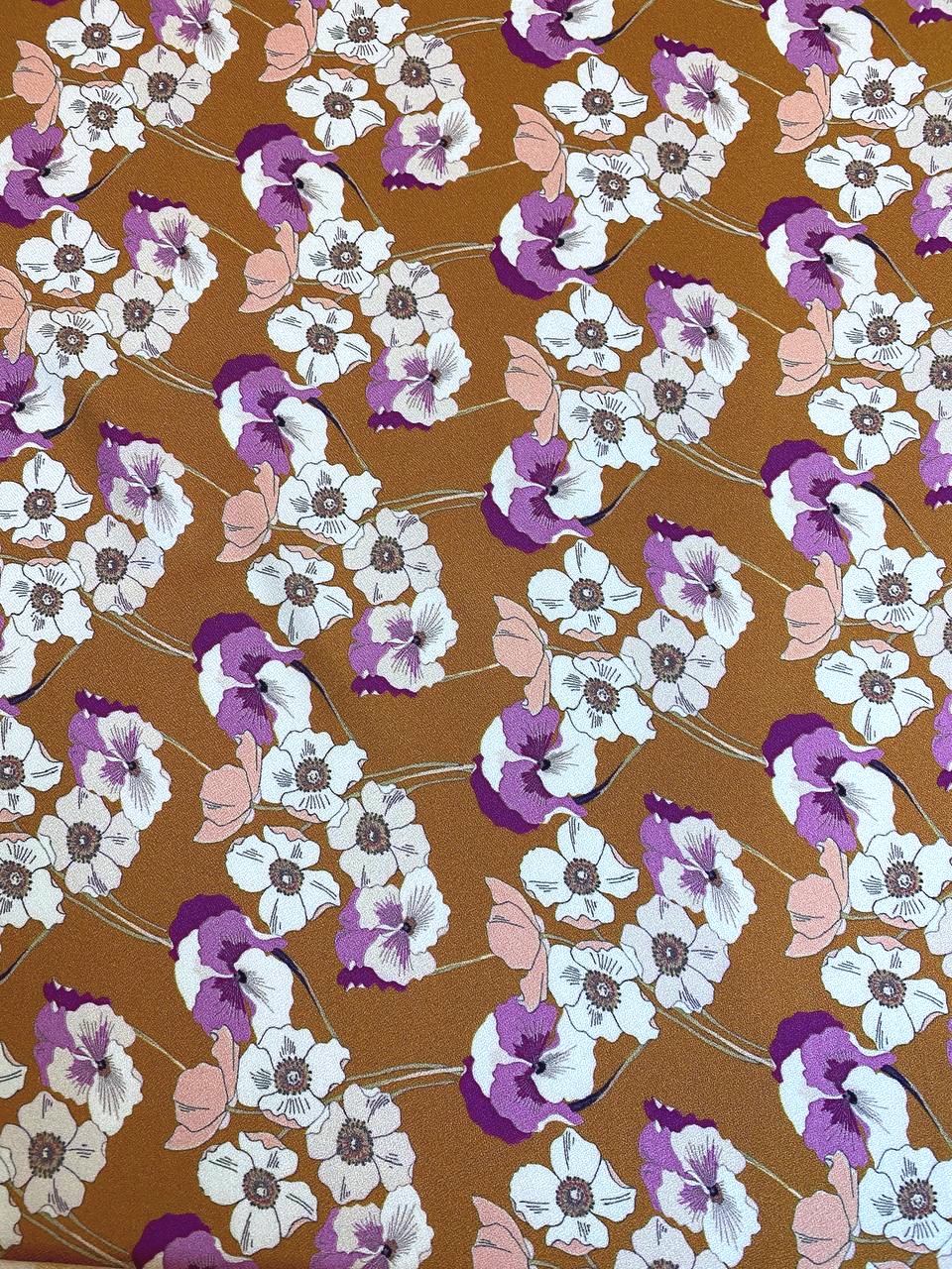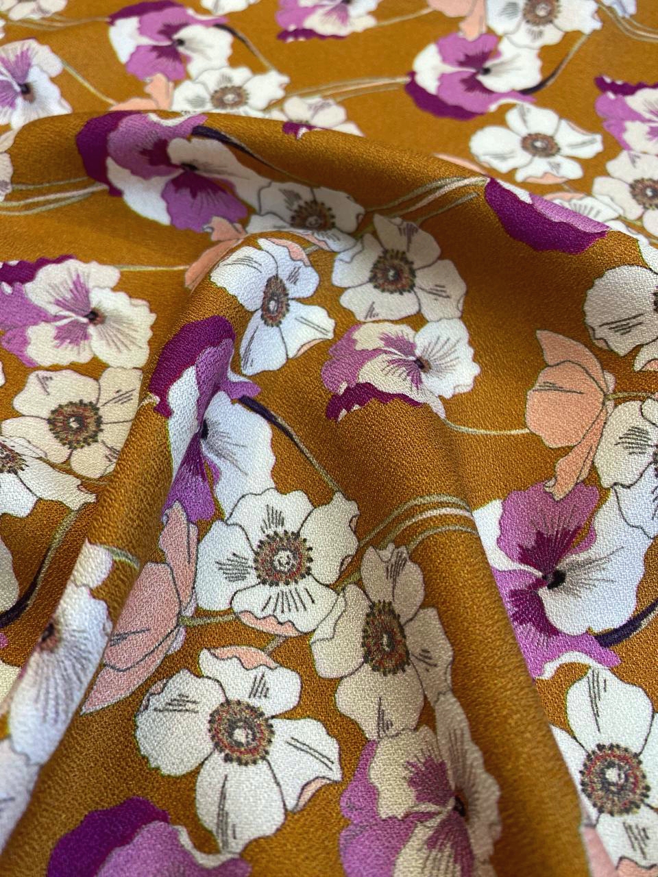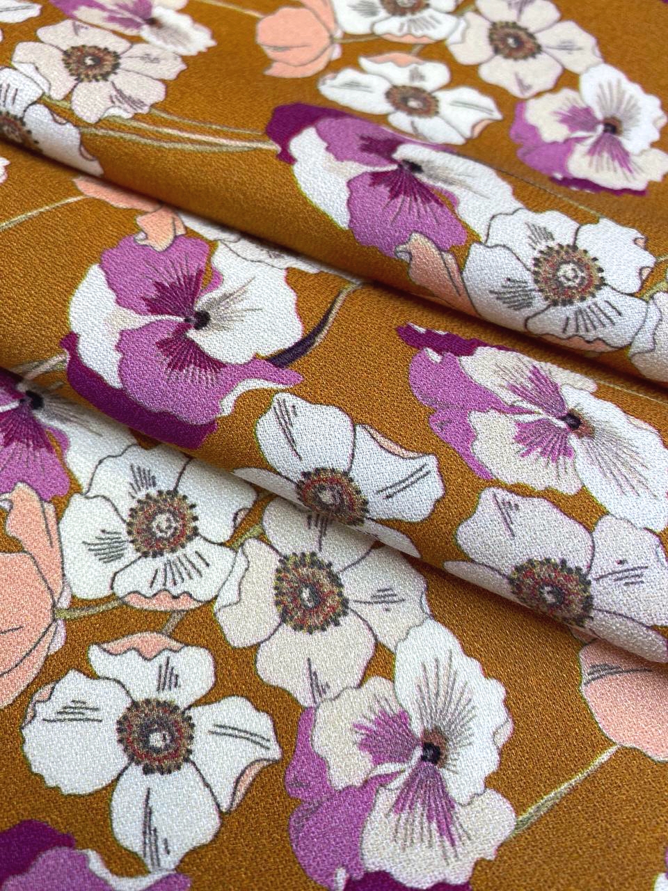 На сочном фоне горчичного цвета нанесены яркие цветы - сочетание оттенков очень красивое.