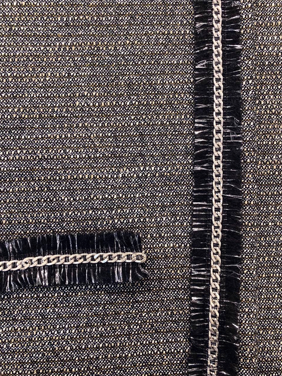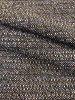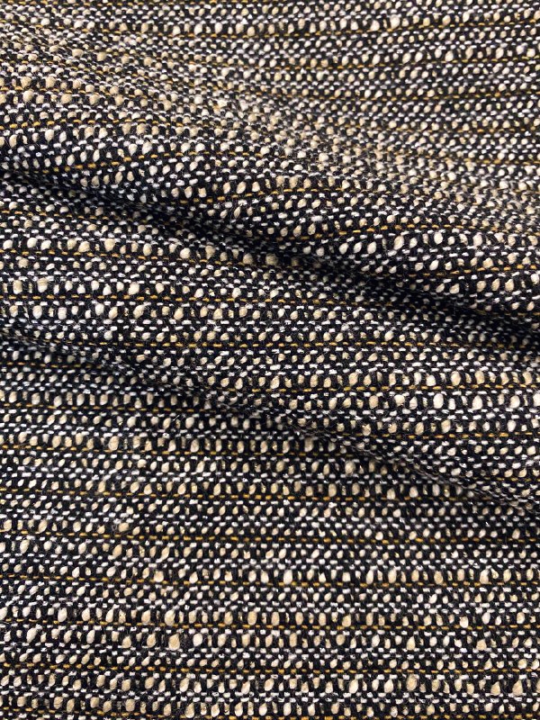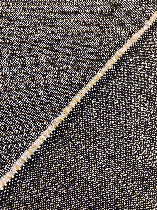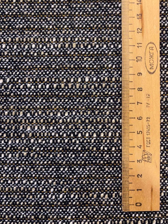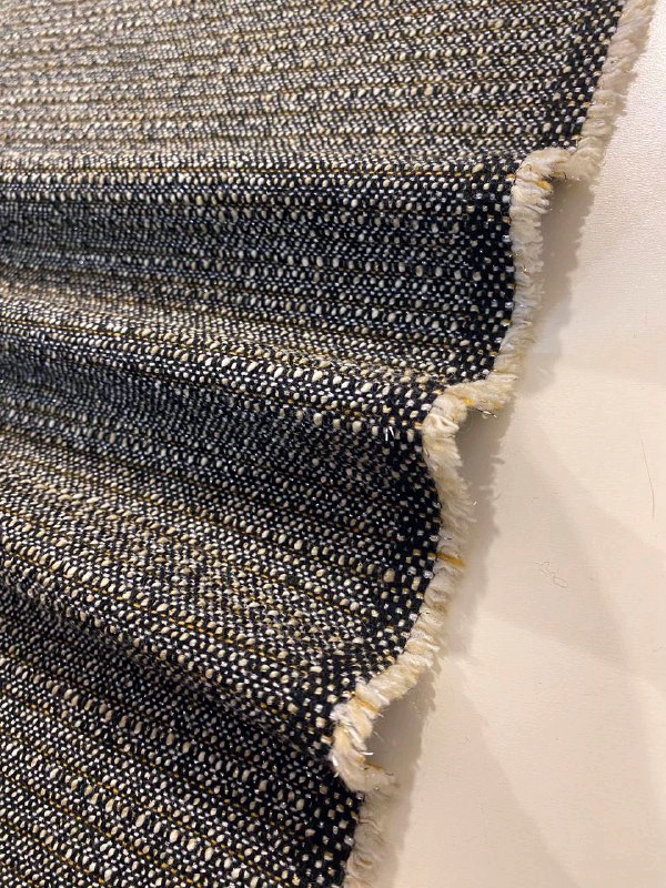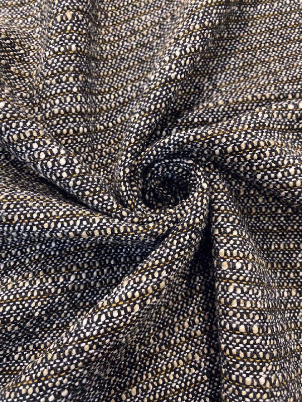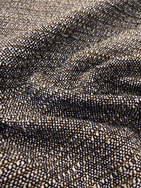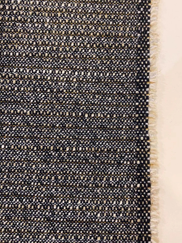 Полотно черного цвета, поперек кромки проложены не толстые нити песочного цвета и тонкие нити люрекса (цвет серебра) придают легкое свечение ткани; мягкая, уютная, не толстая, структура ткани немного рыхлая